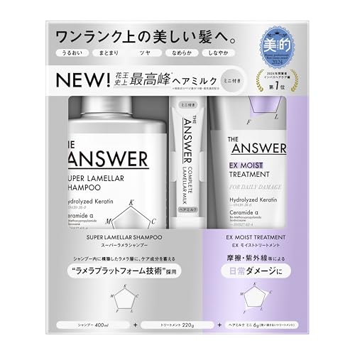 そんな時に見つけたのが、今回ご紹介するTHE ANSWER ジアンサー スーパーラメラシャンプー&EXモイストトリートメント&コンプリートラメラミルクのセットでした。「ラメラプラットフォーム技術」という聞き慣れない言葉と、「美容液のようなテクスチャー」「塗り洗い」という新しいアプローチに強く惹かれ、これは試してみる価値がある!と直感。価格は3点セットで¥3,520と決して安くはないですが、サロン級のケアが自宅でできるならと購入を決意しました。