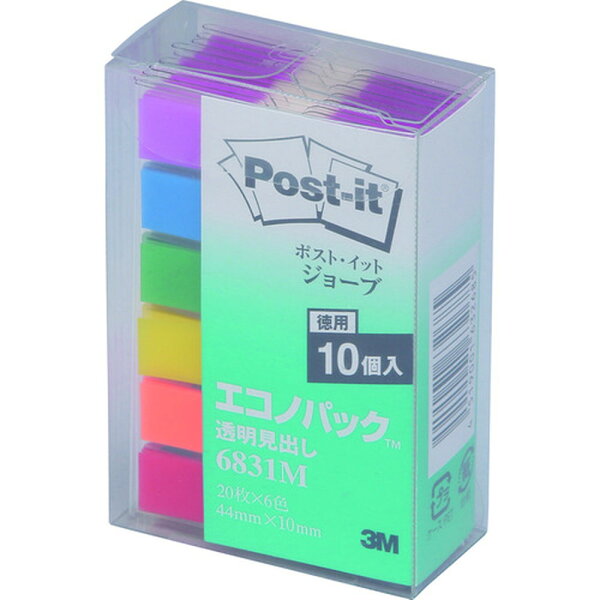 今回ご紹介するのは、「3M スリーエム ポスト・イット ジョーブ透明見出し エコノパック 44X10mm 120枚X10パッド 6色混色 6831M」です。価格は3310円で、モノパ!楽天市場店で購入しました。この商品は、その名の通り、半透明のフィルム素材でできた見出し付箋です。44×10mmというコンパクトなサイズで、1パッドあたり120枚、それがなんと10パッドも入った大容量のエコノパック。赤、青、緑、黄、オレンジ、紫の6色が混色されており、用途に応じて色分けできるのが特徴です。資料や書籍の文字を隠さずにマークできるため、元の情報を損なうことなく整理整頓が可能です。