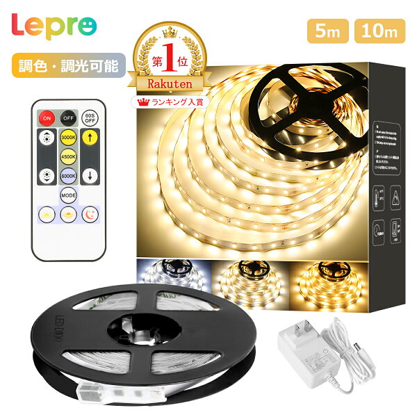 今回レビューする商品は、ショップ「Lepro」から販売されている「Lepro ledテープライト」です。楽天で「1位」を獲得した実績があり、2年保証が付いているため安心して購入できます。5Mと10Mの2種類の長さが選択可能で、リモコン操作で明るさ(調光)と色(調色)を自由に変えられるのが大きな特徴。裏面には両面テープが付いており、ハサミで簡単にカットできるため、店舗や室内、DIY、ホーム装飾用、さらにはクリスマスなどのイベントの飾り付けまで、幅広い用途で活用できるイルミネーションライトです。電球色を含む様々な色で空間を演出できます。