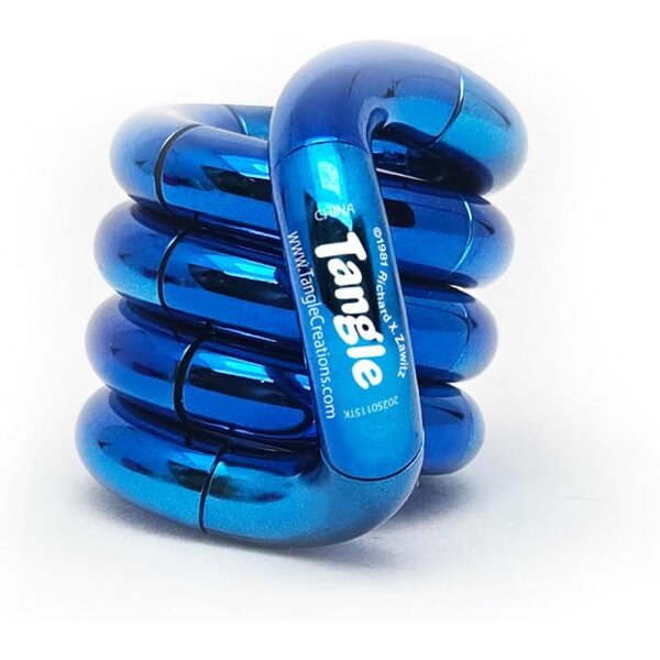 今回ご紹介するのは、カワダが手掛ける「くねくねタングル メタリック ブルー KT-8602b」という商品です。複数の連結パーツで構成されており、それらを自由にひねったり、曲げたりすることで、様々な形に変化させることができる立体パズル、あるいはフィジェットトイといったジャンルのアイテムです。特にこのモデルは、目を引くメタリックなブルーの光沢が特徴で、対象年齢は6歳以上とされています。