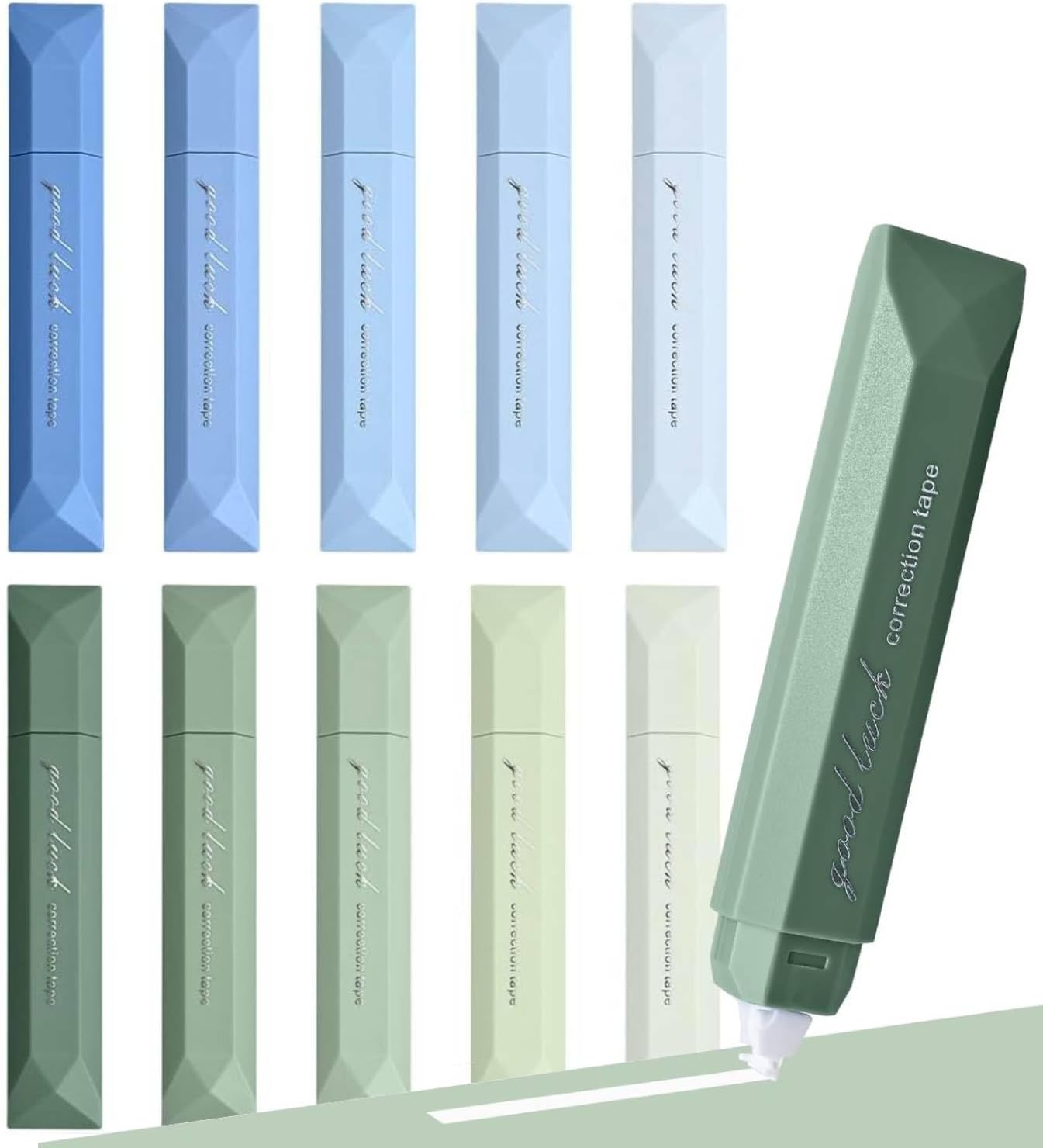 この修正テープは、5グリーンと5ブルーの合計10本パックで、本体カラーが固定されています。もし特定のカラーだけを大量に欲しかったり、他の色のバリエーションを求めている方にとっては、少し物足りなく感じるかもしれません。